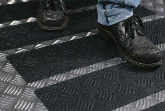 Cinta antideslizante para pisos conformable para usos en gradas, rampas, etc. Con partículas abrasivas cubiertas por un durable polímero, se unen a una capa base de aluminio para permitir la conformabilidad del producto. El reverso de la cinta cuenta con un resistente adhesivo sensible a la presión.