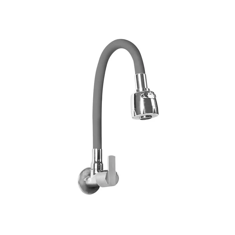Llave de lavadero a la pared para cocina Buzios Lever con pico flexible en acero inoxidable recubierto en silicona de color gris con duchita de ABS, incluye 2 funciones: aireado y lluvia.