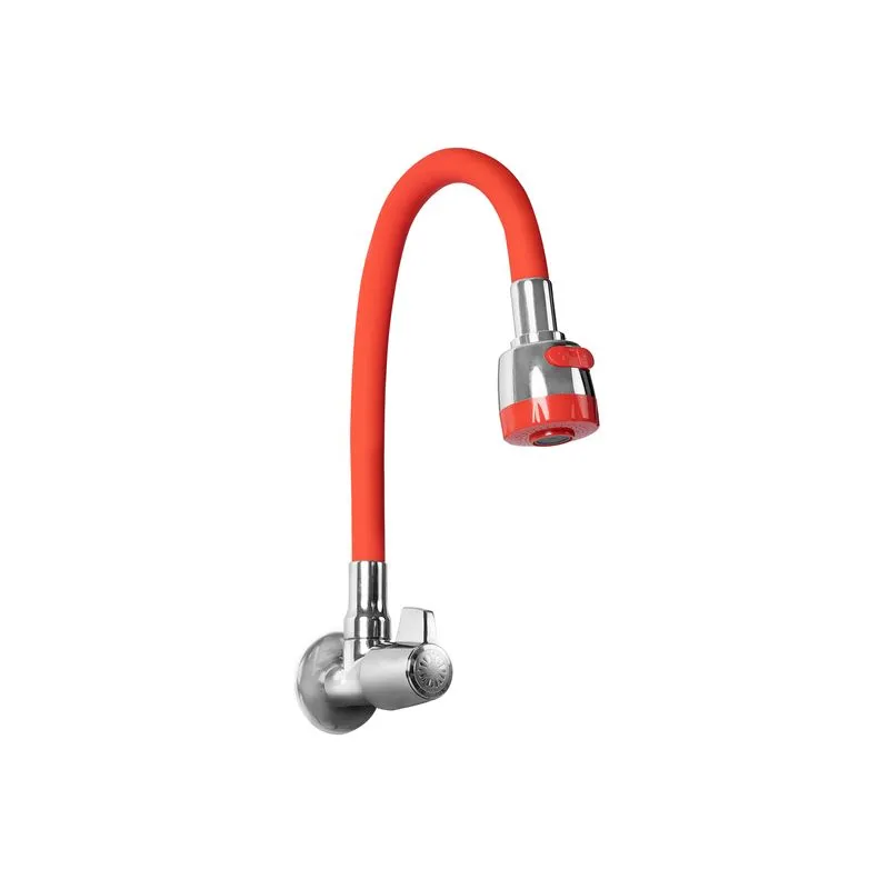 Llave de lavadero a la pared para cocina colección Cabo Blanco con pico flexible en acero inoxidable recubierto en silicona de color rojo con duchita de ABS, incluye 2 funciones: aireado y lluvia.