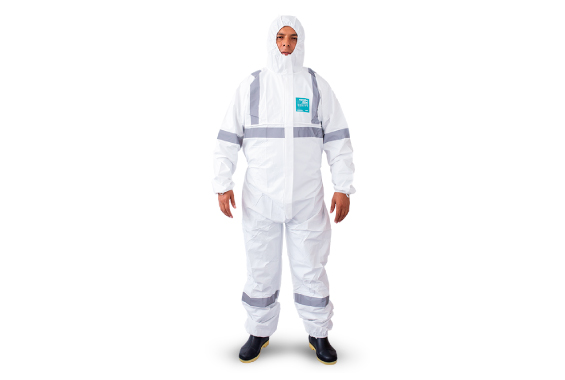 Traje contra partículas y salpicaduras, de uso limitado con costuras reforzadas, de tela laminada con tratamiento antiestático. Capucha de tres piezas, cierre bidireccional, cintas reflectivas y elástico en tobillos, cintura, muñecas y capucha.