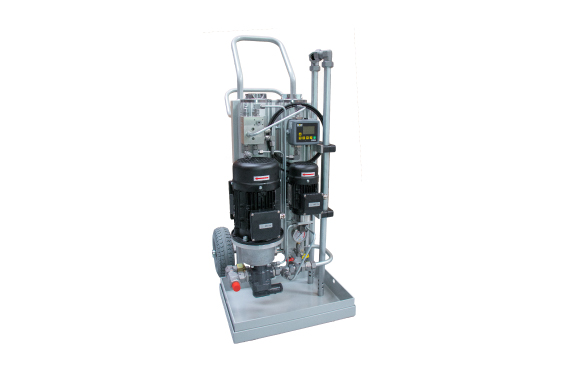 La unidad de filtración portátil tiene una estructura resistente diseñada ergonómicamente con neumáticos para facilitar la maniobrabilidad sobre todo tipo de superficies. La unidad cuenta con bandeja de goteo extraíble. Dispone de dos elementos de fibra de vidrio 60G, un indicador de incremento de presión visual-eléctrico que muestra la saturación del filtro y que automáticamente apaga la unidad. La unidad se suministra con mangueras y tubería de aspiración y retorno.